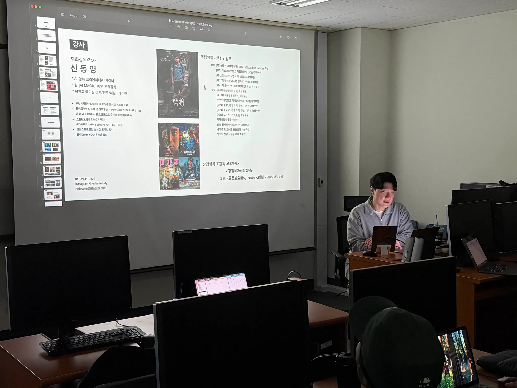 중앙대학교 첨단영상대학원 휴먼AI콜라보레이션 강의에서는 특별한 시간이 마련되었습니다! 신동영 감독님께서 2주간(총 2회) AI 필름 메이킹 특강을 진행해주셨는데요. AI Magic의 메인 연출감독으로서 다양한 툴과 튜토리얼, 그리고 제작 효율을 높여주는 실질적인 노하우까지 아낌없이 전해주셨습니다. 영화 제작 과정에서 인공지능을 어떻게 활용할 수 있는지 직접 듣고 배우는 흥미롭고 유익한 시간이었습니다. 앞으로 연구실의 AI 기반 영화 제작에도 큰 도움이 될 소중한 배움의 시간이었습니다:) 좋은 강의를 진행해주신 신동영 감독님 감사합니다!