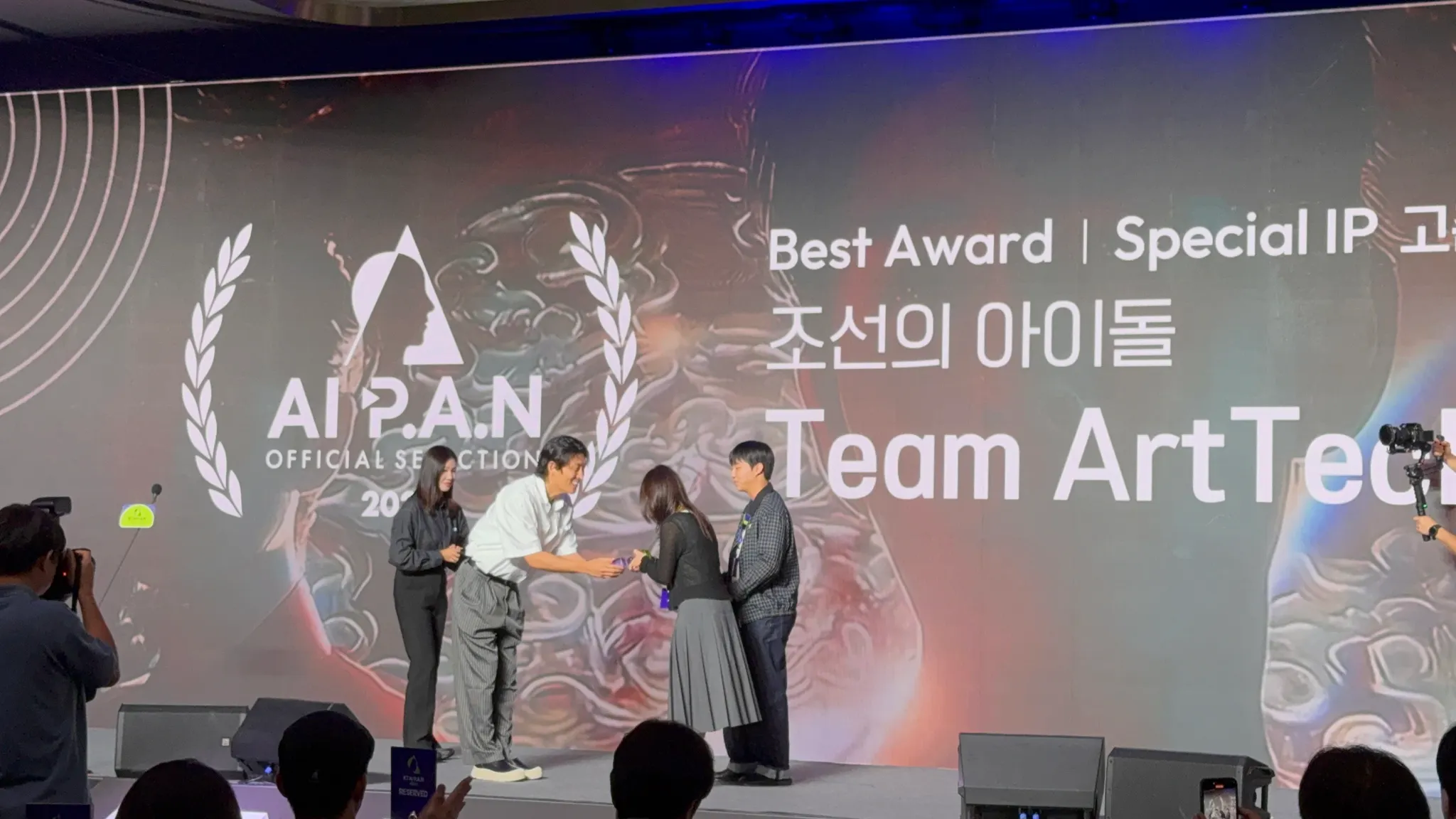 KT AI P.A.N 콘텐츠 공모전 – 스페셜 IP 고준 배우 부문에 작품〈조선의 아이돌〉을 출품하여 최우수상을 수상하였습니다! <조선의 아이돌>은 전통 악기와 한복, 조선 시대 인물을 현대 아이돌 문화와 AI 기술로 재해석해, 신분과 시대를 뛰어넘는 무대를 만들어냈습니다. 이 작품을 통해 “예술에는 신분이 없다”는 메시지를 강렬하게 전달했습니다. 심은성 연구원이 감독, 연출, AI 이미지 생성과 편집을 맡아 작품을 이끌었고, 정지형 연구원도 AI 이미지 영상 생성에 힘을 보태며 함께 완성도를 높였습니다. 연구원들은 “AI를 활용해 기존 영화 제작 방식과는 다른 실험적인 시도를 이어가고 싶었다”며, “제한된 시간 안에서도 집중도 있는 구성을 만들고자 노력했고, 하고 싶은 작품을 즐거운 마음으로 제작하며 주도적으로 이끌어간 경험이 큰 기쁨이었다”고 소감을 전했습니다. 수상을 진심으로 축하합니다~!!
