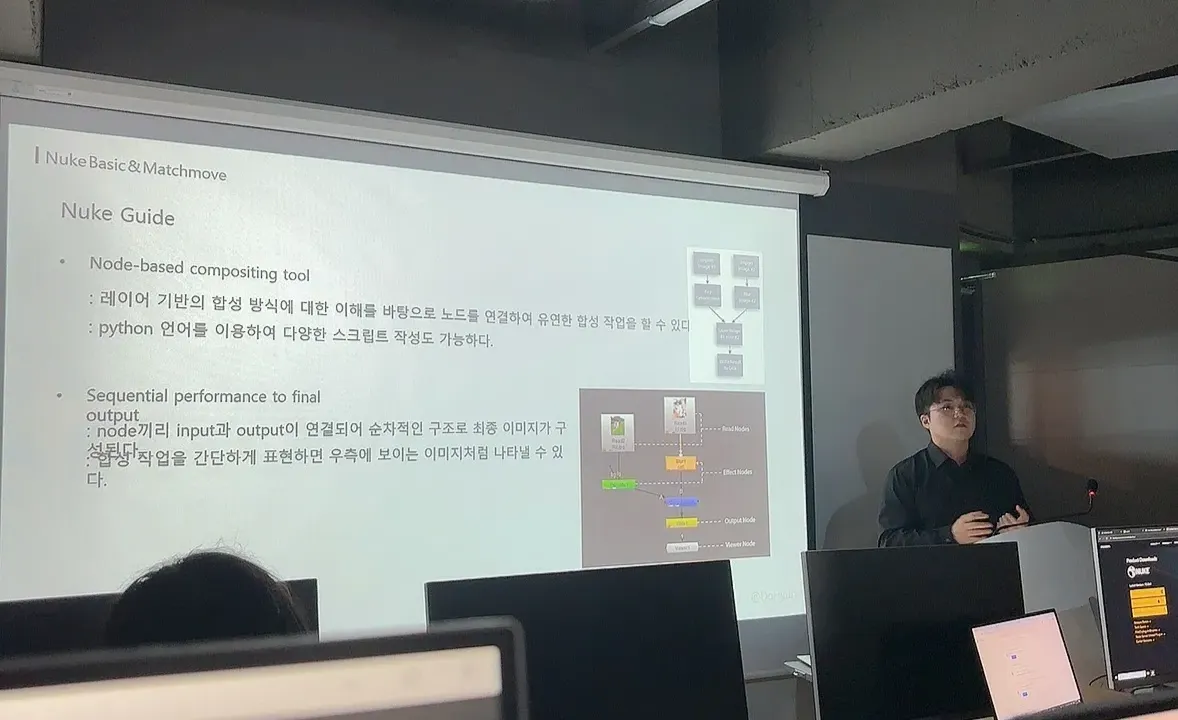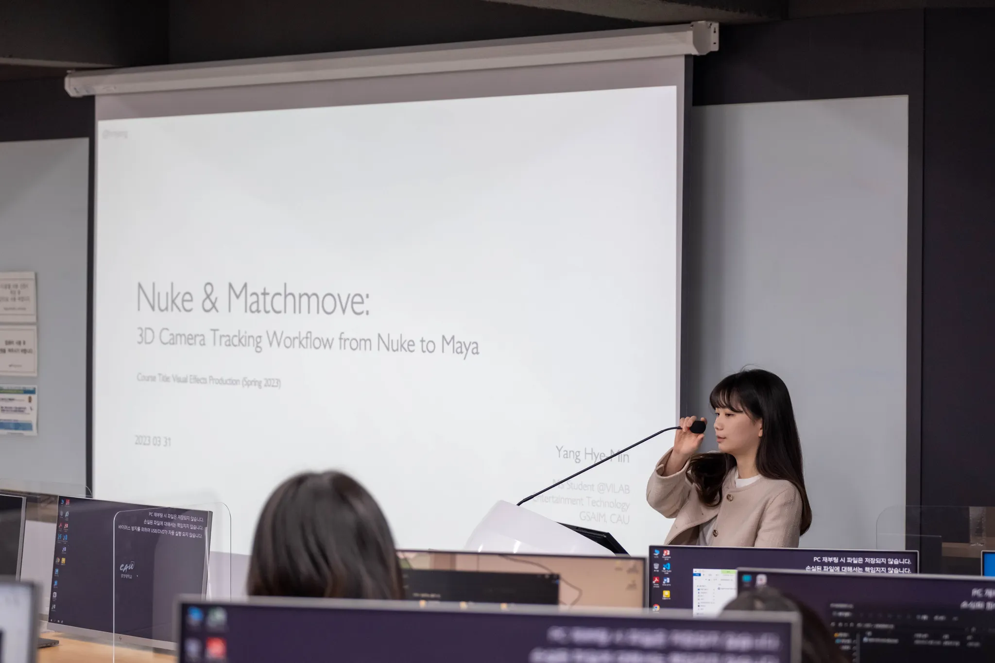 중앙대학교 예술공학대학 수업에서 석사 과정 양혜민 연구원이 Nuke 특강을 진행했습니다. 학부 학생들이 직접 컴퓨터 앞에서 실습하며 Nuke 프로그램과 매치무브 워크플로우에 대해 알아갈 수 있는 시간이었는데요, 특강을 통해 VFX에 한 발짝 더 다가간 모습을 볼 수 있었습니다:D 특강을 열심히 준비한 양혜민 연구원 수고 많았습니다